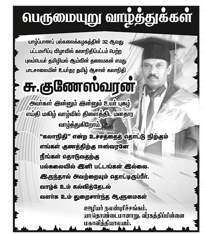 வித்தியாலய ஆசிரியர் சு.குணேஸ்வரன் யாழ்ப்பாணப் பல்கலைக்கழகப் பட்டமளிப்பு விழாவில் கலாநிதிப் பட்டம் பெற்றுக்கொண்டமையினையிட்டு வித்தியாலய சமூகத்தினால் பாராட்டு விழா ஒன்று முன்னெடுக்கப்பட்டது.